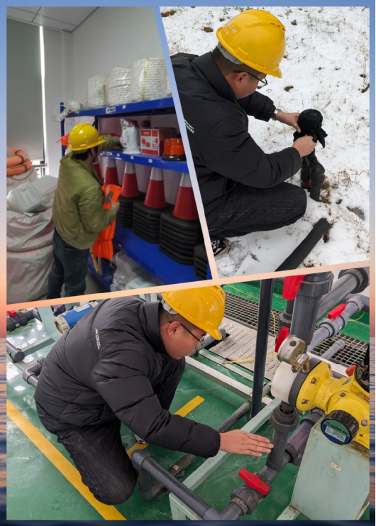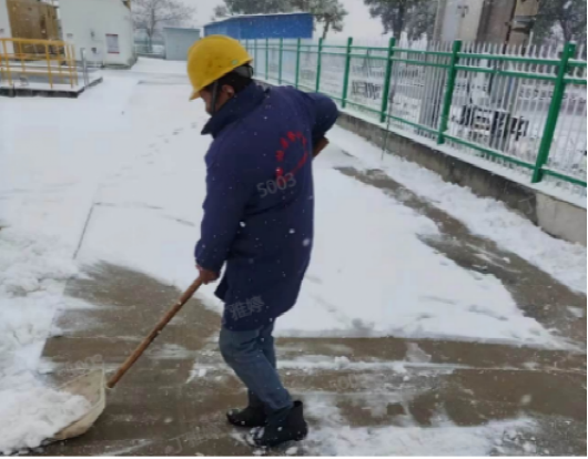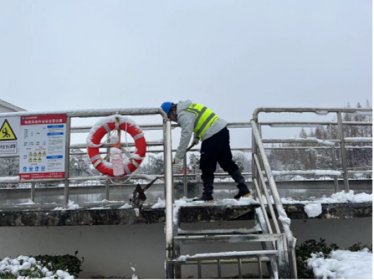 以“雪”為令,行動在前。建立應急保障三級梯隊,各生產廠區“以‘雪’為令”,堅持“即下即清”的原則,及時清理巡視路線、辦公區域、平流池積雪并鋪設防滑墊,放置融雪劑、除冰鏟,切實保障職工人身安全。污水處理廠的管道系統在低溫下容易結冰,為防止設備在低溫下出現故障,對所有污水處理設備進行保溫處理,用保溫材料包裹水泵、電機等關鍵設備,以減少熱量散失。